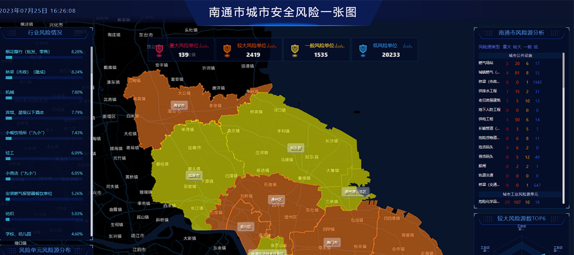 We carry out risk identification and assessment for 3 districts, 1 county and 3 county-level cities of Nantong, including material collection, interview and investigation, construction of urban risk platform, online filling, risk assessment and on-site review.